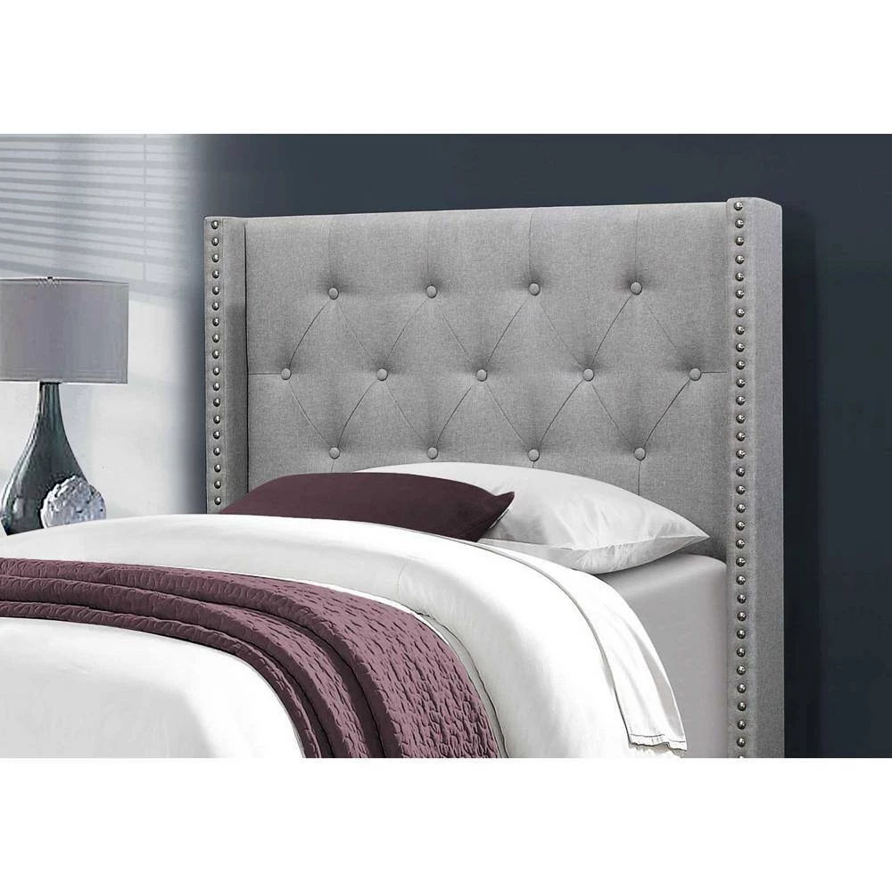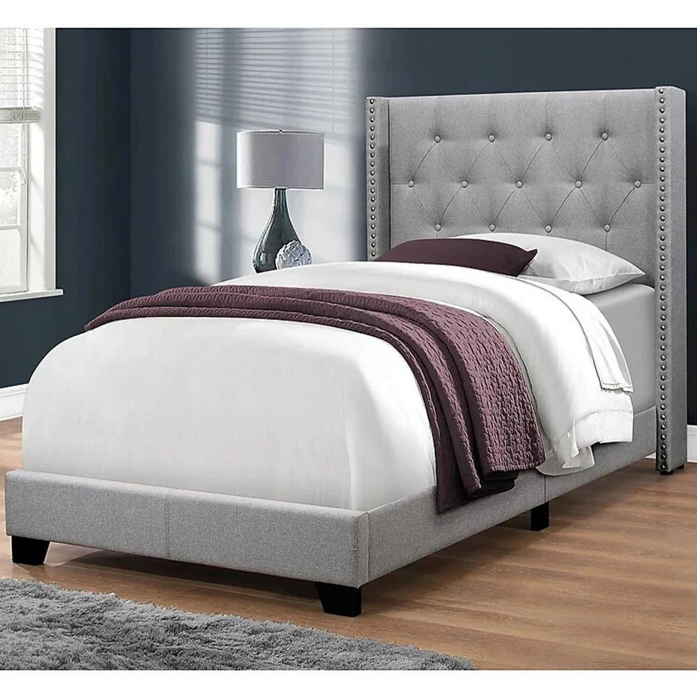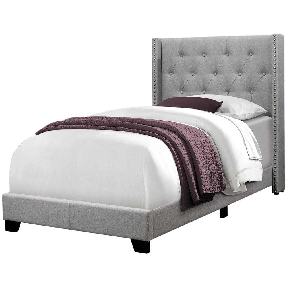 Give your bedroom a master appearance with this luxurious queen size bed frame with a wingback headboard upholstered in an elegant grey linen-look fabric. The classic contemporary style of this floor length headboard, outlined with chrome nail head trim down the sides and cushioned Diamond tufting, gives the bed an understated flair. The clean lines of the upholstered sides and front frame along with the black solid wood legs, slightly angled at the front, adds stability to the whole bed frame. The box spring and mattress is not included and must be purchased separately. All parts and hardware for assembly are included.