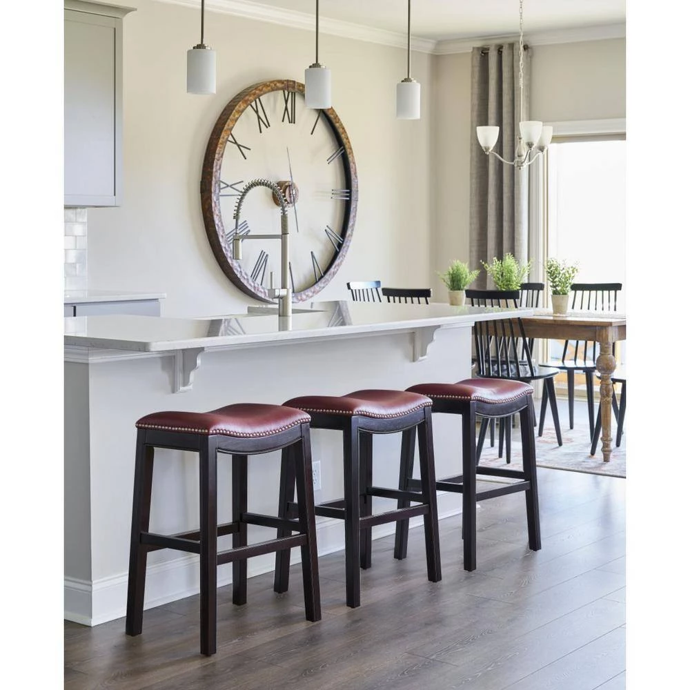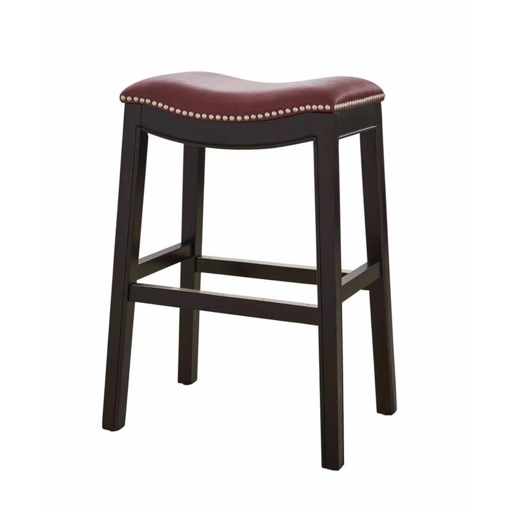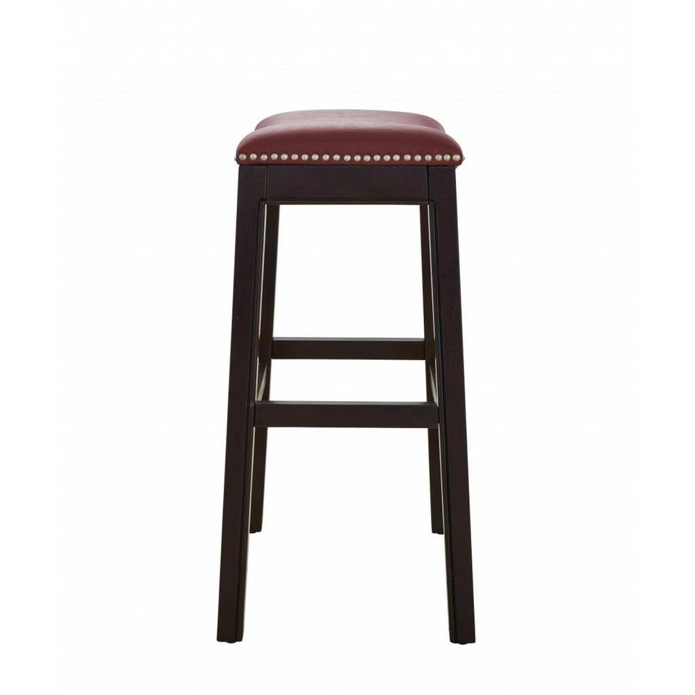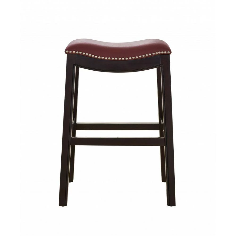 Old world details mix with modern design elements in this 25 in. Espresso and Red Saddle Style Counter Height Bar Stool. This rich dark finish counter height stool blends sturdy solid wood construction with soft cushioned faux leather seating that is complimented by nail head details. The classic saddle style seat is comfortable and gives this stool a casual air that makes it versatile enough for kitchen, bar area, or any room that needs extra seating. 25 in. x 20.5 in. x 14. 25 in. Solid Wood Construction / Foot Rest for Comfort / Metal Cover on Footrests for scratch protection.