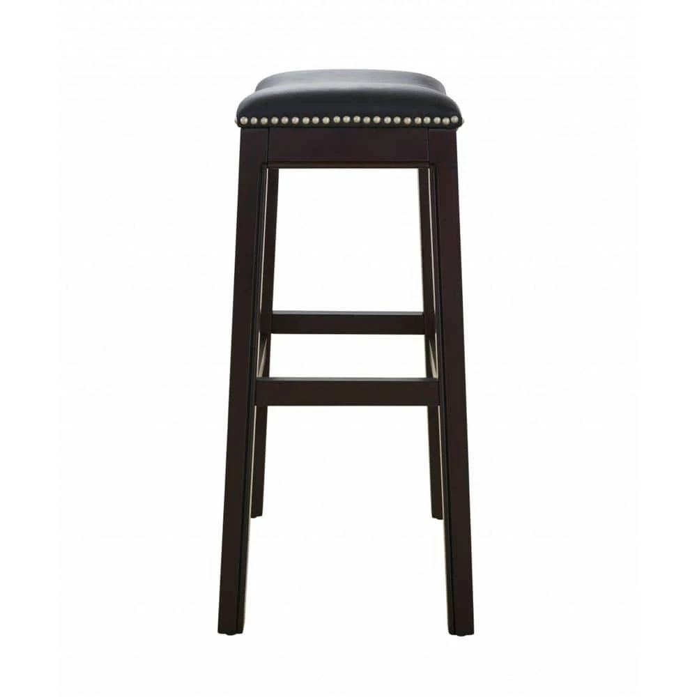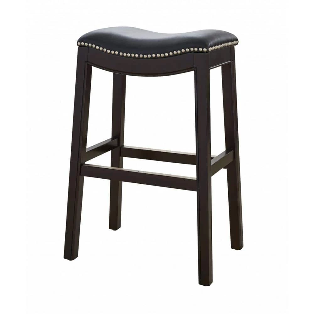 Old world details mix with modern design elements in this 30″ Espresso and Black Saddle Style Counter Height Bar Stool. This rich dark finish counter height stool blends sturdy solid wood construction with soft cushioned faux leather seating that is complimented by nail head details. The classic saddle style seat is comfortable and gives this stool a casual air that makes it versatile enough for kitchen, bar area, or any room that needs extra seating. 30″ x 20.5″ 14. 25″ Solid Wood Construction / Foot Rest for Comfort / Metal Cover on Footrests for scratch protection