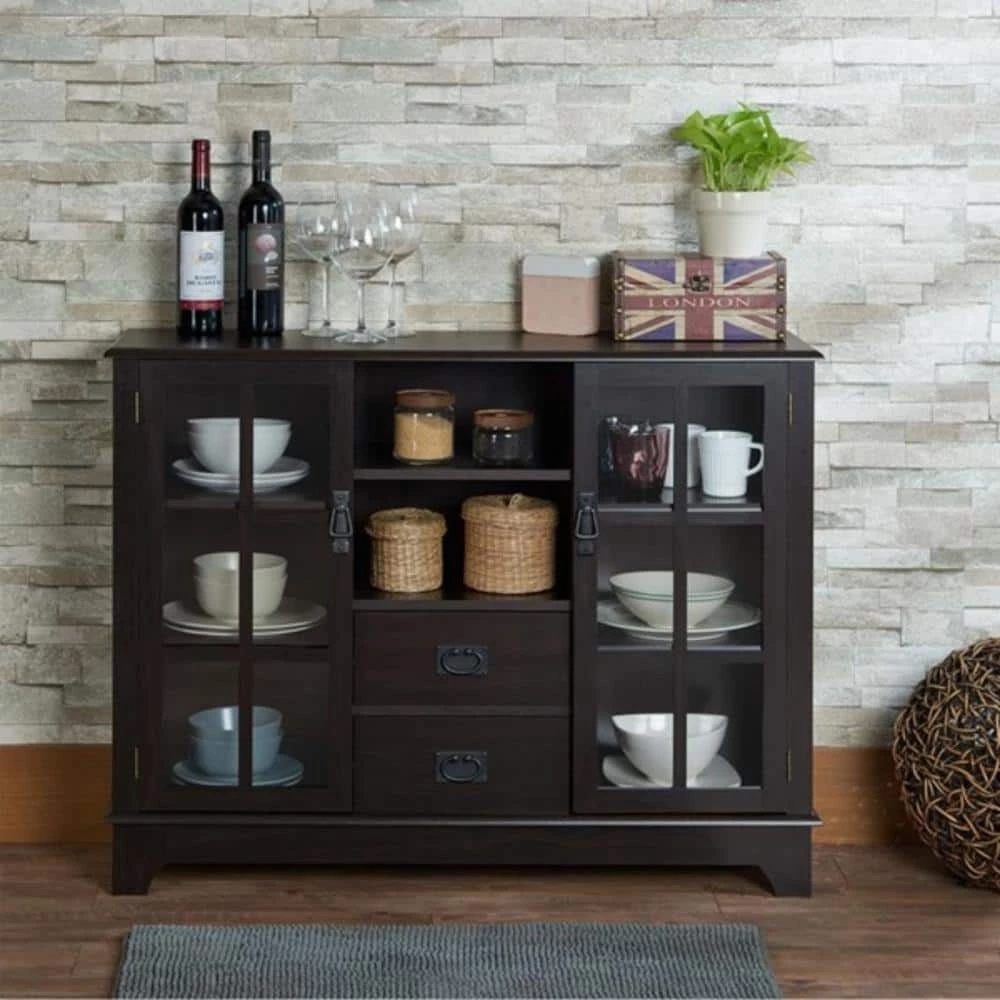 Whether you want this alluring cabinet in your bedroom or dressing room, it will seamlessly anchor any existing setting. Beautifully fashioned, this accent piece has got an appealing profile that will quickly become a focal point in any room. It features a framed glass door with see-through shelves inside and two middle drawers, meaning there is ample space for keeping and organizing your personal essentials. The overall construction is creatively finished in walnut that can easily match any existing room decor. Middle shelves dimension: 13L x 10D x 7H