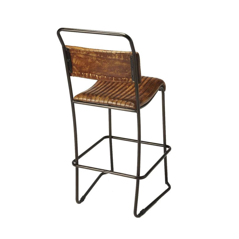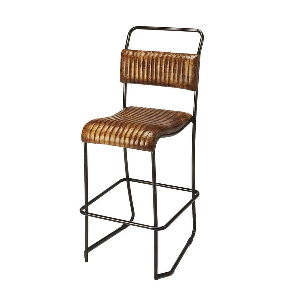 Natural Brown Leather and iron black finished metal are paired together to create this masterpiece. It’s ribbed like supple leather seating along with a similar backrest is curved and angled to perfection offering a comfortable seating experience. Four long iron beamed legs surrounded by a square iron rim contribute to it’s stability and sturdiness. Pair it along with your bar counter and watch it compliment the entire room. 46 in. x 16 in. x 20 in.