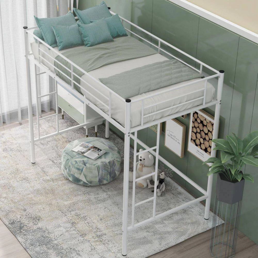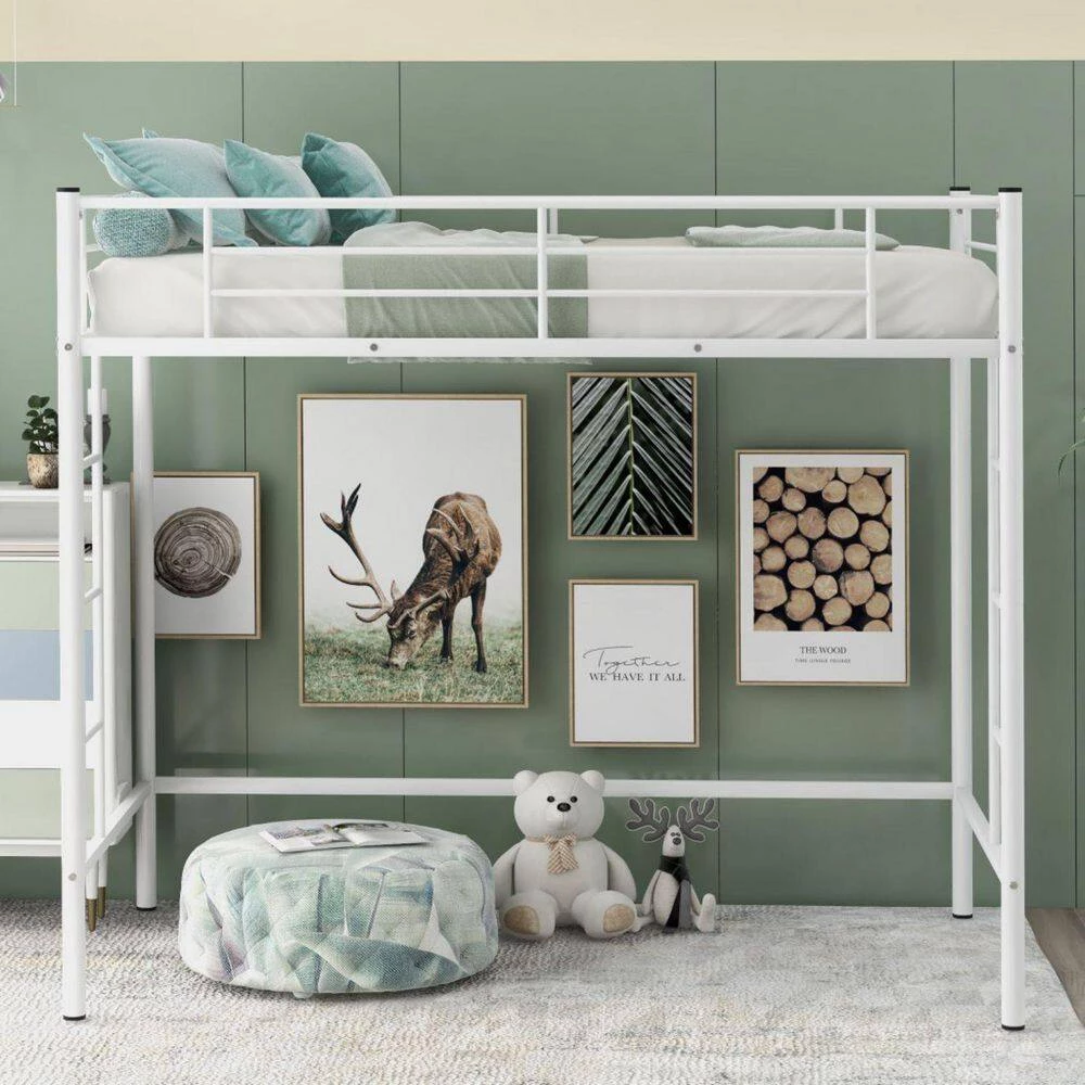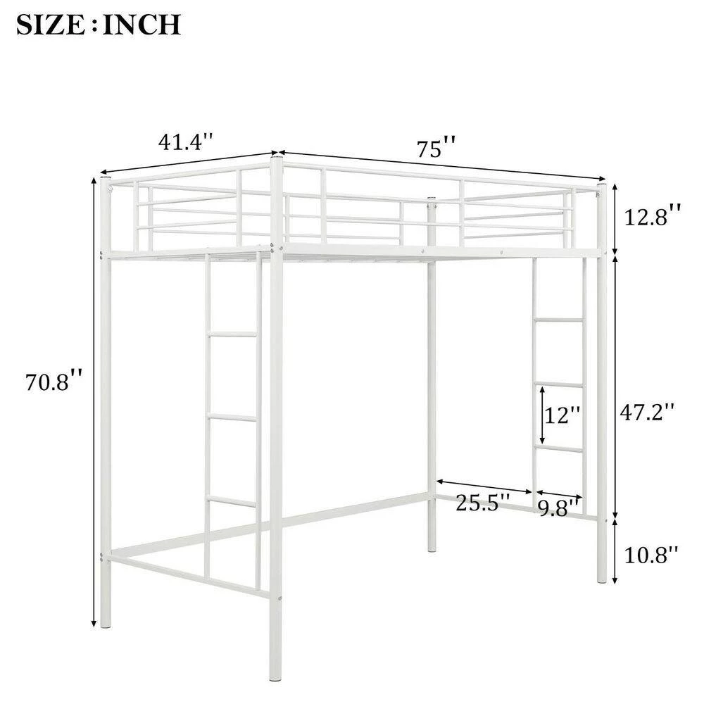 The White Twin Size High Loft Bed lets you save space wherever you need it. This super elegant loft bed features a high all-metal frame with a super clean-cut silhoutte. The loft bed features a metal guardrail on all sides, ensuring safety while sleeping, and the bed has easy access with the two ladders, one on each side. This beautifull loft bed has an expansive under bad space that can be used for relaxing, studying or playing. 71″H x 75″W x 41″D
