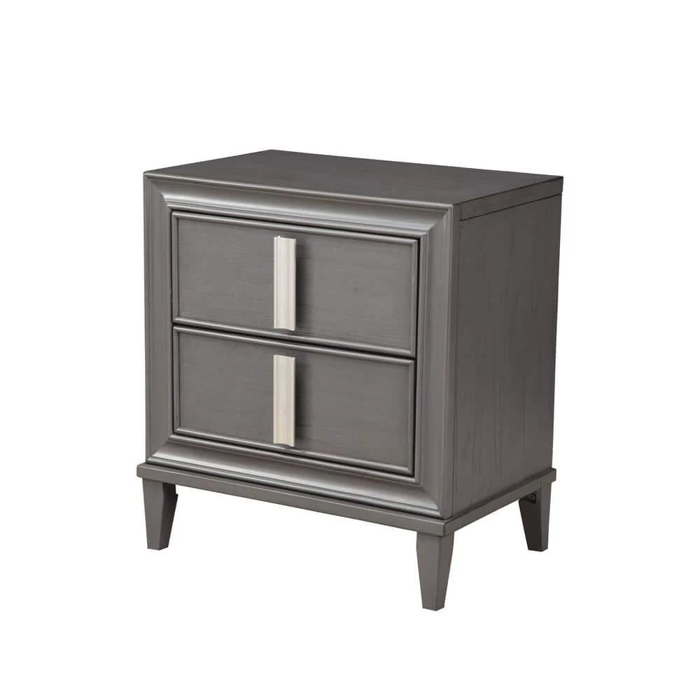 Organize your living space and get the contemporary style that you deserve with this Dark Grey Contemporary 2 Drawer Nightstand.A dark grey finish is accented by bold nickel horizontal drawer pulls giving this cabinet a definitive contemporary feel.Sturdy construction of solid woods and veneer, tapered off the floor legs and two sizeable drawers round out this piece for that perfect chic and sophisticated look.28.5 in. x 27 in. x 17.5″.