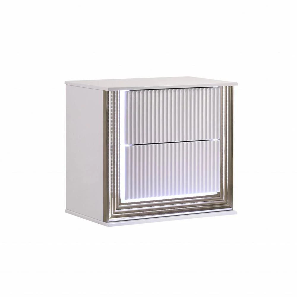 This Stunning Bright White Two Drawer LED nightstand is an exciting and glamorous addition to your bedroom.This bright, white, updated, modern nightstand will surely wow with its sleek and unique LED design and mirror trim accents. There is plenty of storage built in with its two modern style handle-less drawers that are outlined with awesome LED lighting.This desk’s beautiful aesthetic provides a fresh, updated element to any bedroom space.25 in. H x 17 in. W x 27″ D.