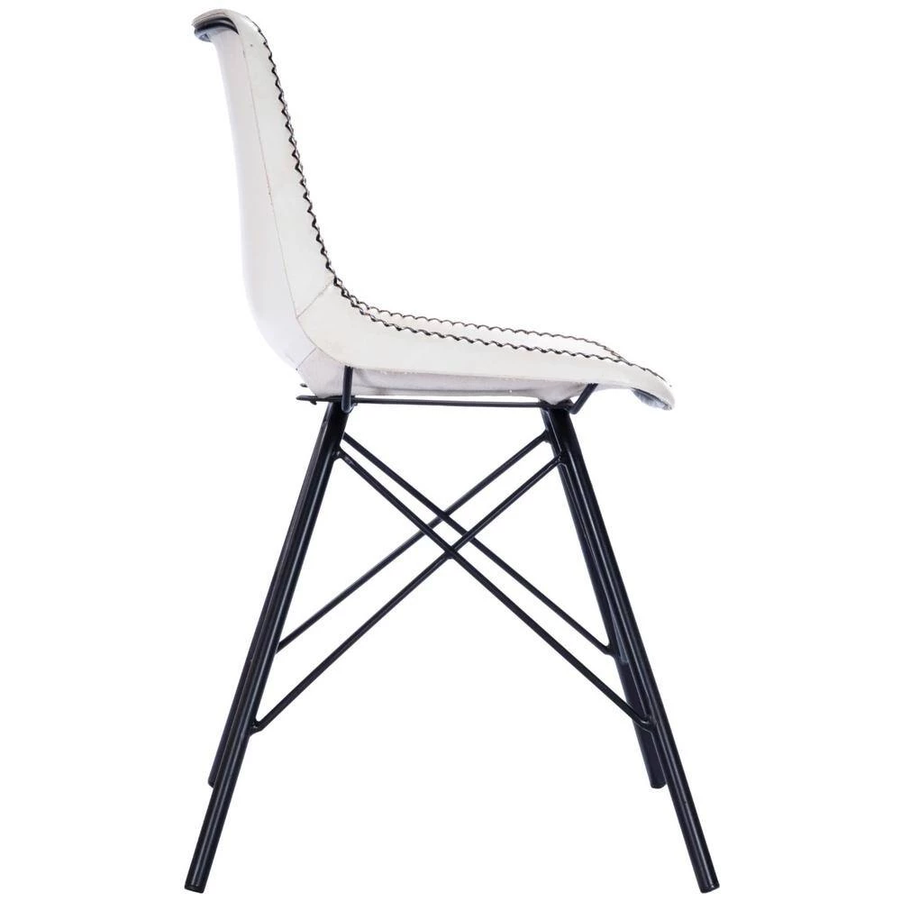 Highlighting your decor has never been easier, the Black Contrast Stitch Leather Dining or Side Chair adds a touch of mid-century modern with a hint of contemporary. Exquisitely molded from pure white leather bucket seats with a contrasting black cross stitch seam and propped upon Eiffel tower styled black iron legs, it is perfect to compliment any space, be it your home, office or restaurant. Minimalistic in design this captivating silhouette can be easily transferred from room to room for a better seating experience. 31.5″ x 18″ x 14.5″