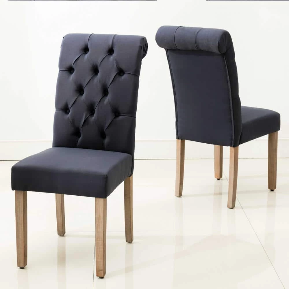 This 2-piece set of button-tufted dining chairs combine comfort and modern design to pep up your dining space. They come with roll-top accents, covered with sophisticated grey linen-blend fabric, which are complemented by stylish weathered brown wooden legs. Also, our modern dining chairs feature classic comfort, modern design and solid construction, all combined to make a perfect blend with any dcor. – PERFECTLY SIZED: Each chair measures 26.75″L x 17″W x 38.5″H and weighs 15lbs to perfectly fit your dining area. Some assembly required – QUALITY CONSTRUCTION: This chair set is made from select hardwoods for durability and style with a linen fabric upholstery covering a 1.8 density fire retardant foam – MODERN DESIGN: Features a weathered hardwood construction and a neutral blue fabric upholstery – WHAT’S INCLUDED: The chairs come with a set of two upholstered dining chairs that are perfect for your kitchen, dining room, or bar area – MATCH ANY DCOR: This set of two chairs have neutral colors with weathered wood legs so you can match it with any dcor in your home, kitchen, and dining room