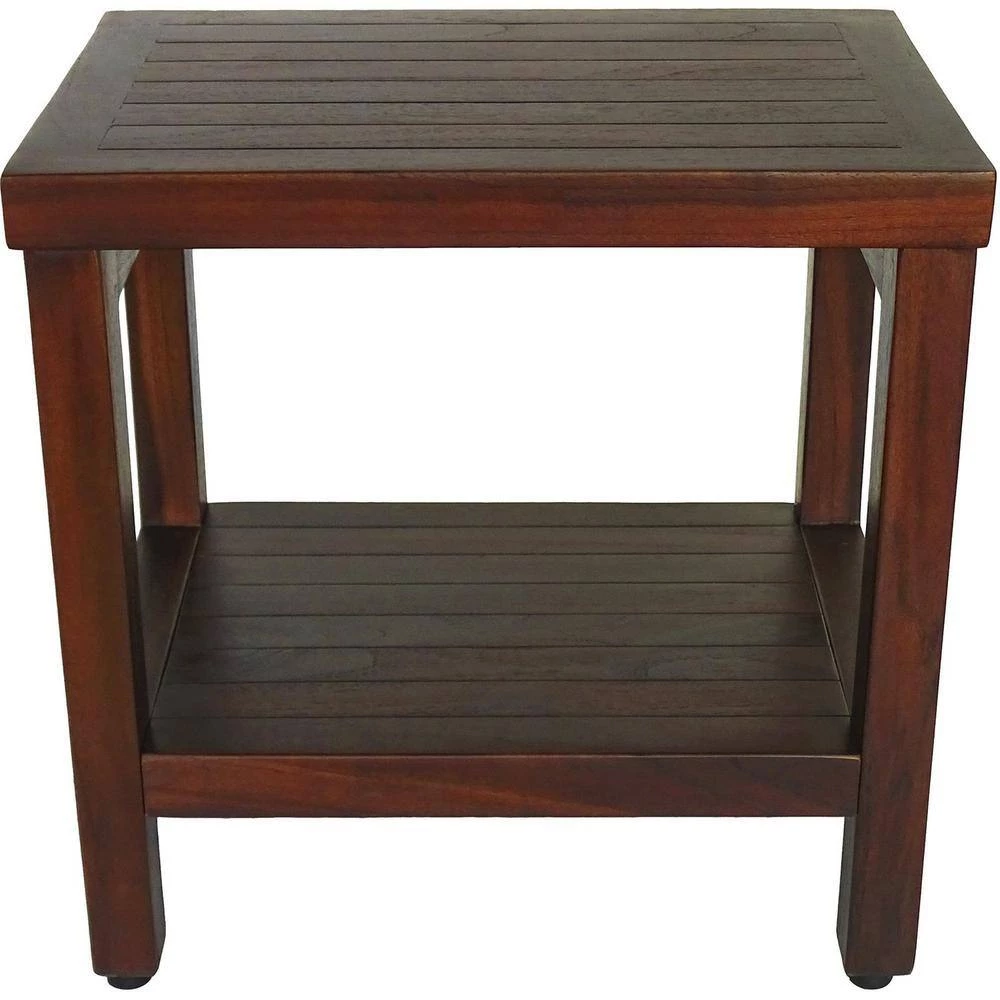 This 18 in. L classic traditional teak shower stool is multi-functional and sturdy. The included standard storage shelf provides extra storage for toiletries or towels. This compact size of 18 in. L x 13 in. W x 18 in. H provides a compact footprint that will fit in most showers. This stool includes foot leveling pads to provide extra flexibility and stability to allow stabilization due to any minor slope in shower floors. It provides the ability for this teak furniture to be used outdoors as well as indoors.