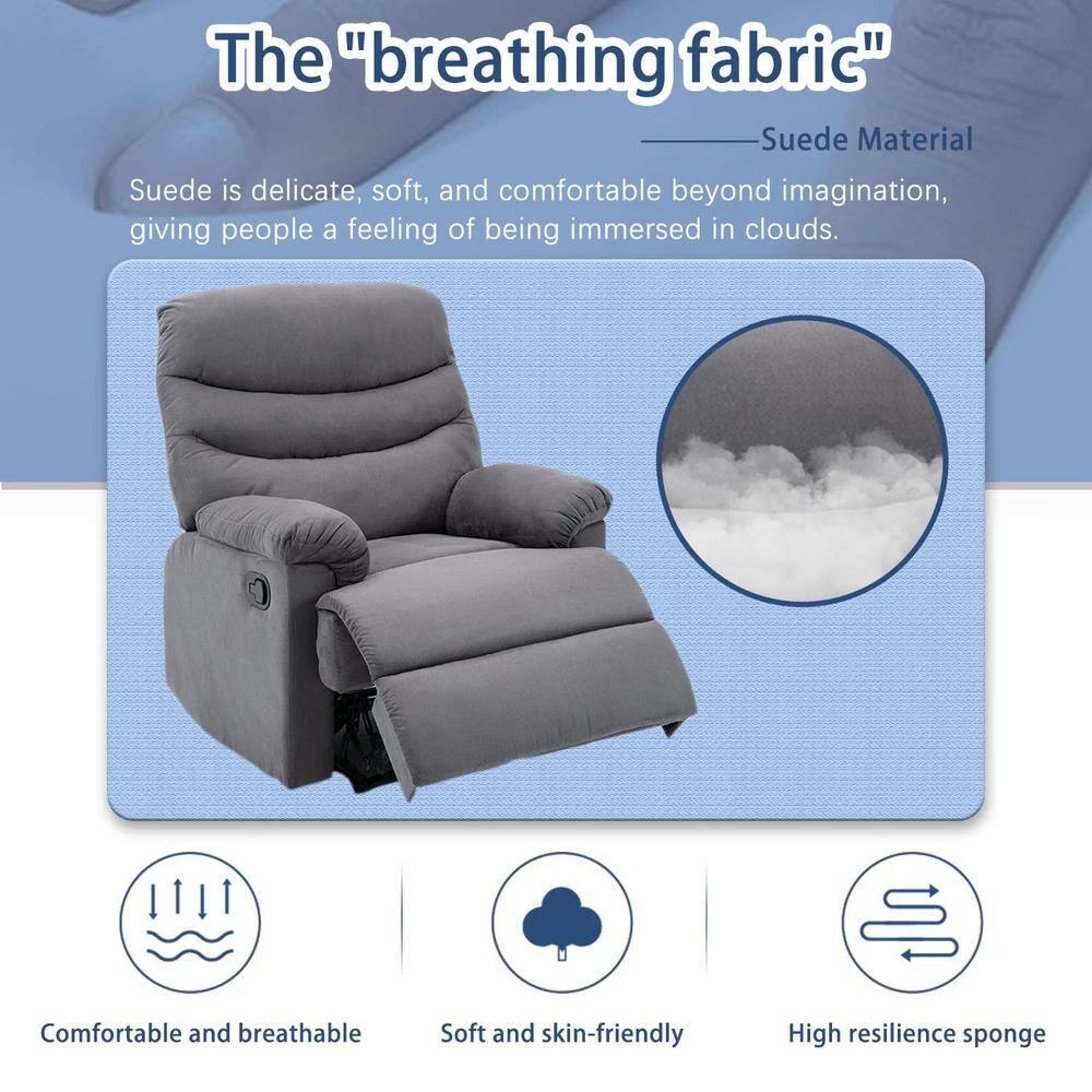 Enjoy all that life has to offer from the comfort of your living room with this Primo Grey Suede Massaging Recliner Chair. This adjustable manual recline chair comes in super soft and squishy grey suede microfiber that is super durable and “life-proof”. Easy to mantain, this chair will stay looking good for years to come. This recliner adjusts to a wide range of angles that are comfortable for sitting, lying, and sleeping. The adjustable intensity massage function operates with the included remote control and will work wonders on your low to mid back! This ergonomically designed chair will be the ideal place to read, watch tv, or take a nap after a hard day’s work. 39″ x 32″ x 34″.