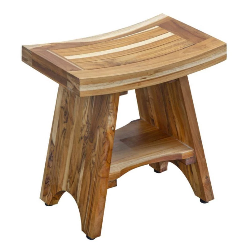 The curved Asian inspired design is sure to please. A fashionable and practical piece, this can be used indoor or outdoors. Compact Curvilinear Teak Shower Outdoor Bench with Shelf in Natural Finish.