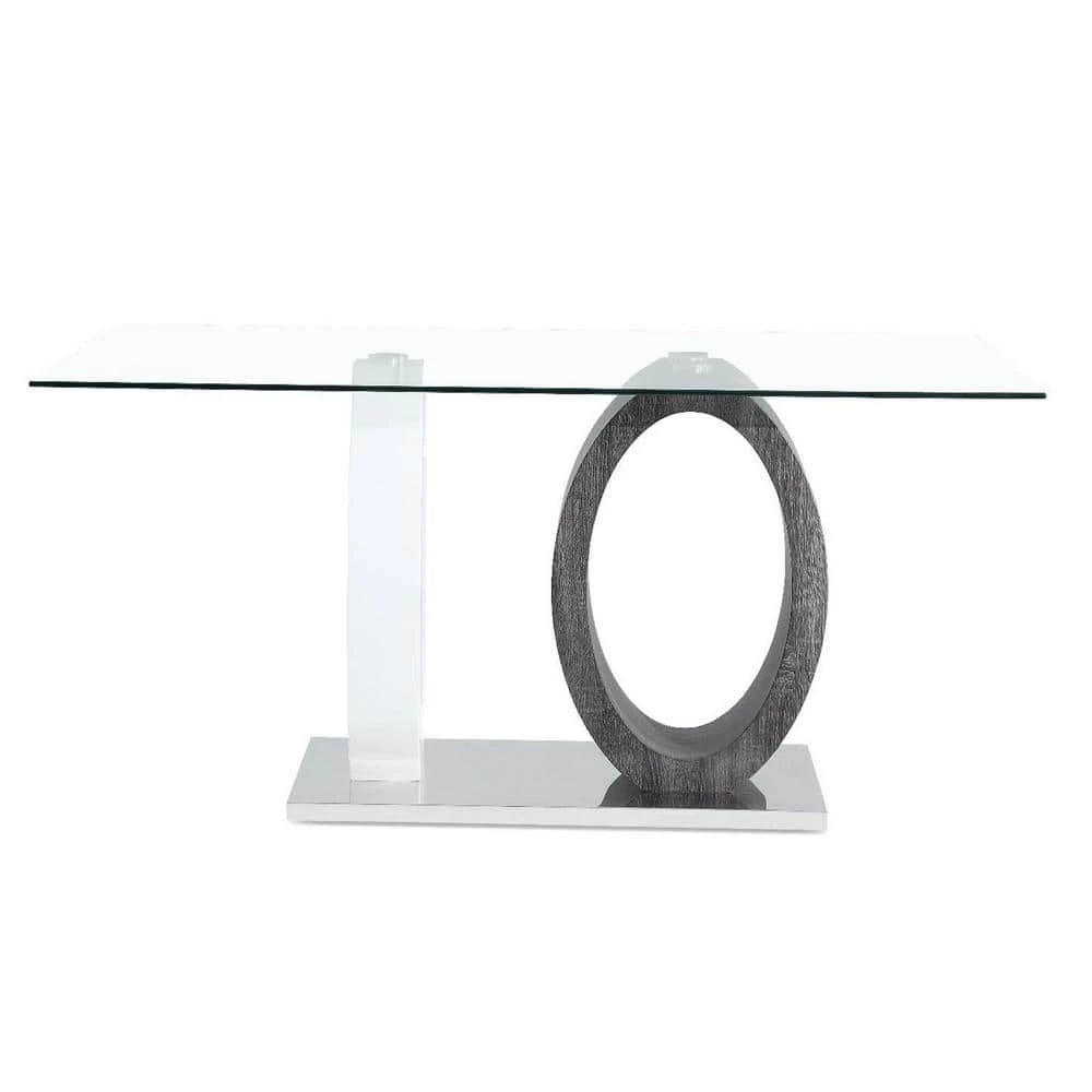 Striking ultra modern design and bold styling this dining table is in a class all by itself. This table boasts a rectangular clear glass top, contrasting oval design supports, stainless steel base with a polished chrome finish. add this to your dining area and be the topic of conversation with all your friends. Add class and royalty to your space with this state-of-the-art dining table. Crafted from carefully selected and durable materials. It has an eye-catching design that refreshes the decor of your dining room. Combines functionality dynamic look and cozy appeal. (Chairs not included)