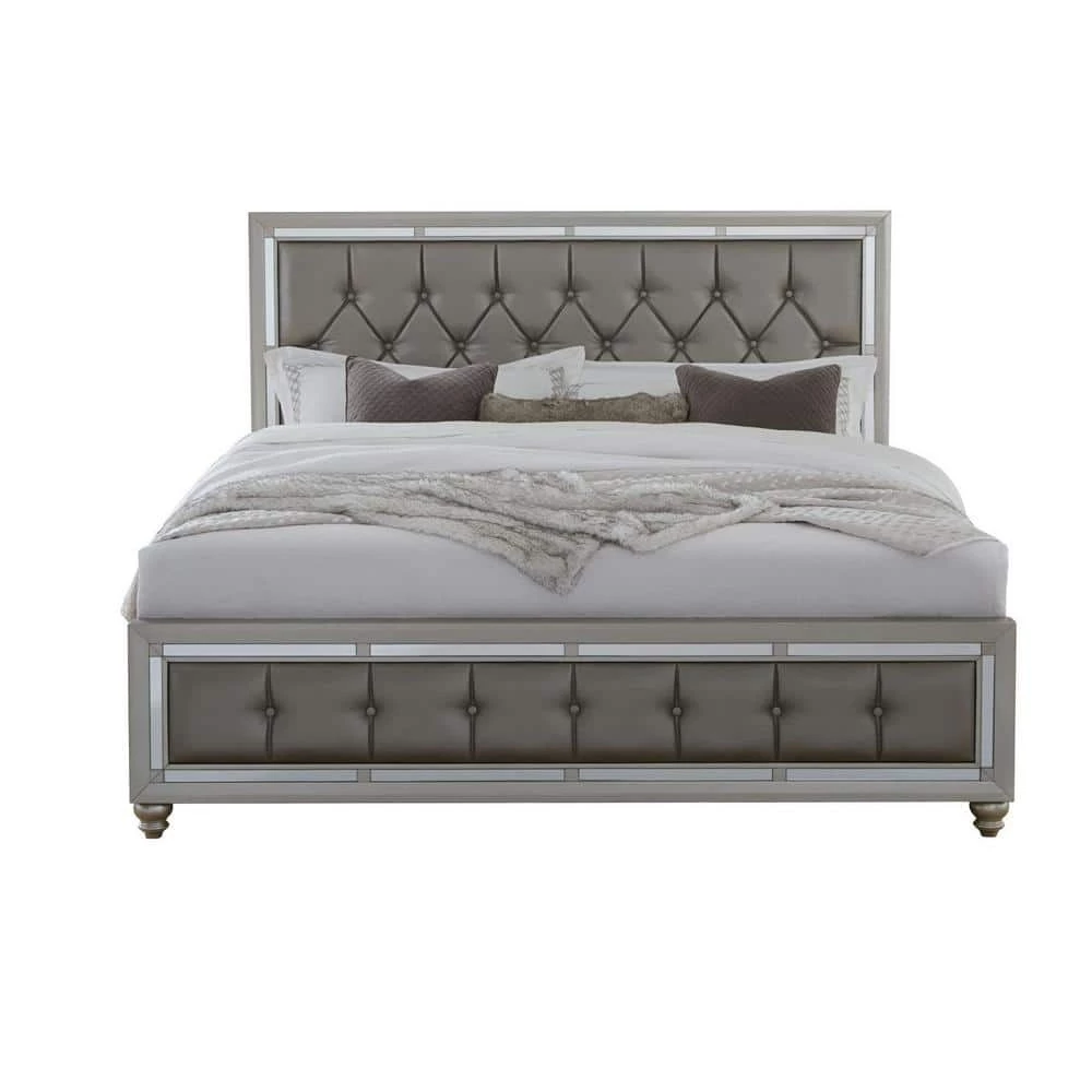 Shown here is the delightful full bed, sure to create a charming, elegant look for your sleeping area. This contemporary with a touch of the traditional, bed is available in a sleek silver champagne tone, which makes coordinating your bedroom decor easy and stress-free, (mattress and box spring not included). This bed is spacious and has stunning highlights including crystal embellished tufted padded head/footboard, with detail stitching, and has mirror trim accents that complement the overall design and contributes to the lovely and sophisticated appearance of this furniture. Quality craftsmanship in every facet of production ensures durability and long-lasting wear. Create the inviting bedroom setting of your dreams by having a full bed and watch your bedroom area become a haven for relaxation and sweet dreams for years to come.