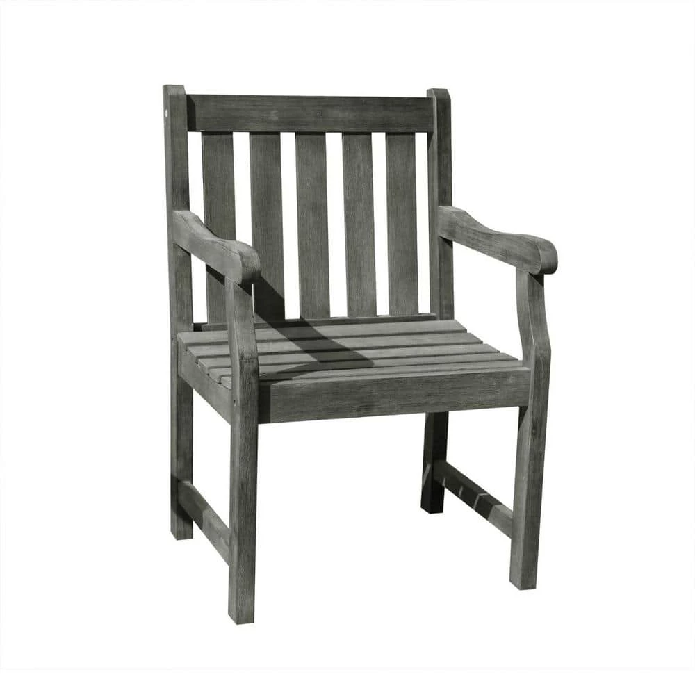 This Distressed Garden Armchair is a great seating solution for your backyard space. The beautiful distressed wood finish and exquisite craftmanship make this chair truly elegant in any outdoor space. Use this chair in your garden or patio, or easily combine multiple chairs for a full outdoor dining set. The slatted seat ensures that water will not pool, making this a very durable and easy choice for outdoor furniture. 35 in. H x 22 in. W x 22 in. D.