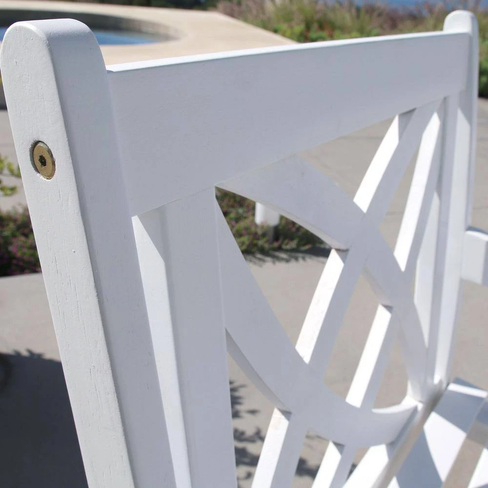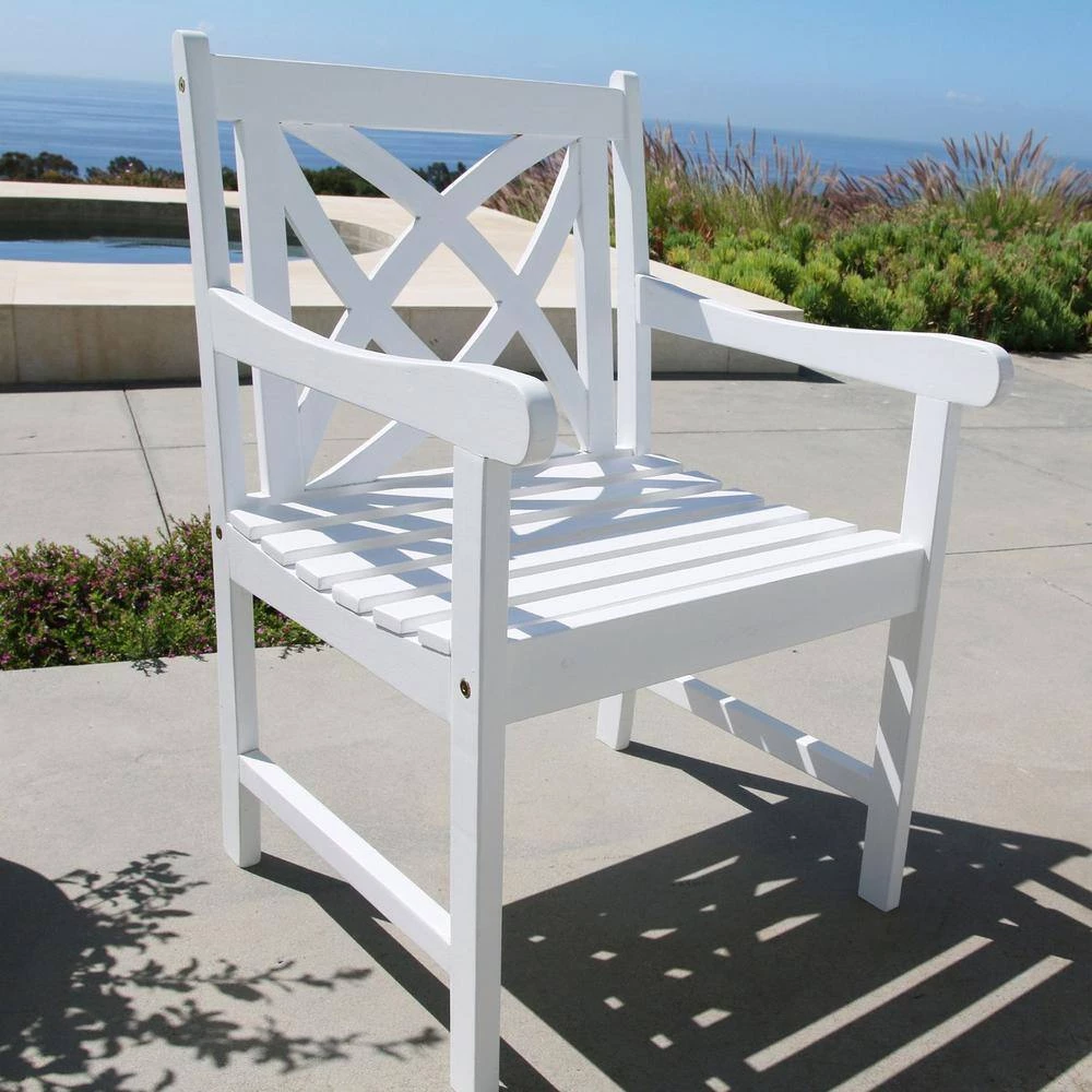 This White Patio Armchair with Decorative Back is the perfect outdoor accessory. Sit comfortably with style in this sturdy and elegant outdoor armchair with arm rests. This chair is perfect for lounging by the pool or reading a book on your patio. The beatiful white wood finish gives a fun, updated outdoor feel to your seating area. This chair is made from 100% premium quality Acacia hardwood that is prone to resist mold, mildew, and decay. 34″ H x 24″ W x 24″ D.