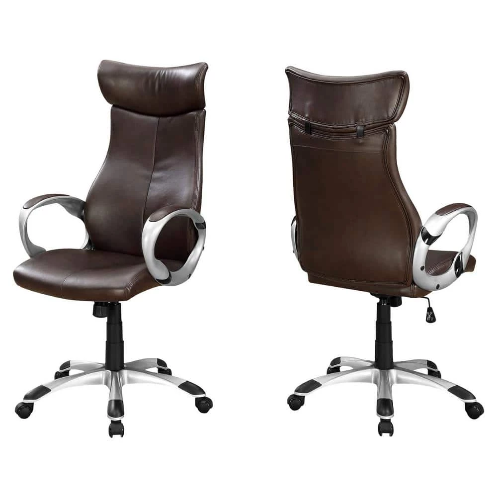 Bring comfort and style together with this modern high back leather-look executive office chair. BIFMA certified for home or commercial use, this elegant brown executive chair is supremely cushioned and curved to support your back and head, accented with rounded sleek silver armrests. The thick swivel seat conveniently adjusts to your desired height with a lever, along with a tilt back lock-in mechanism. The sturdy silver metal base with five capped nylon castors, smoothly glides across the floor for easy mobility. This easy to assemble trendy executive office chair gives a rich look to any office or gaming space.