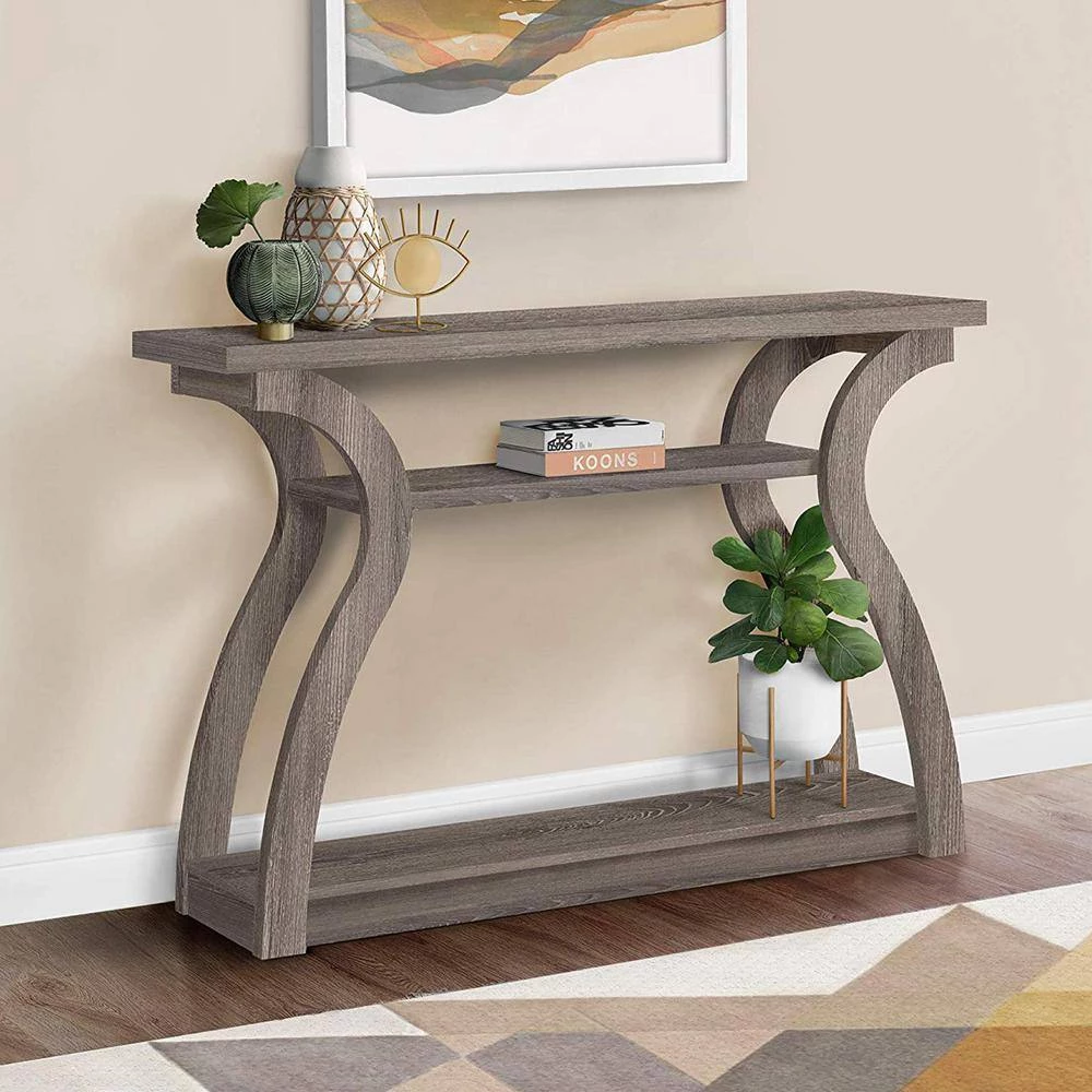 Grab your guests’ attention with this stylish dark taupe wood-look accent console table. Featuring a unique curved base and a 3-tiered open concept design, this modern unit is perfect for dressing up any wall in your home or displaying your favorite decorative items. Spruce up your hallway and add a touch of elegance to your home with the Monarch 3-tier Wood Dark Taupe Console Accent Table. This open concept design, unique curved console table gives you 3-tiers of storage for your decorations or for stashing a key bowl. It’s made with sturdy engineered wood and finished in a dark taupe color and reclaimed wood finish that complements any home decor. It’s so sturdy, it can hold up to 18 lbs. on each shelf. This accent end table is CARB compliant and takes only 30-minutes to assemble.