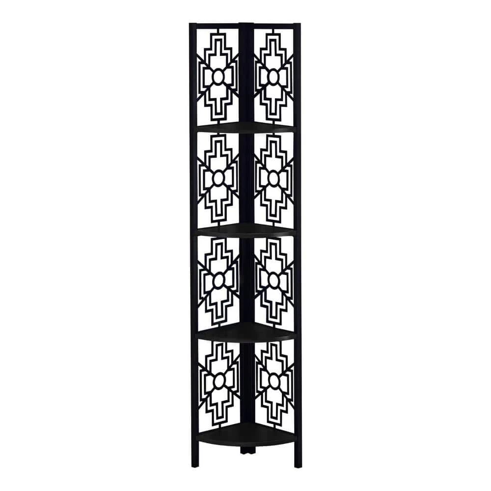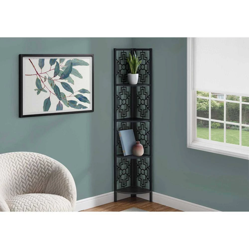 Let this stylish corner cabinet conquer the clutter in your small home, apartment or condo by providing 4 solid black display shelves that are perfect for, photo frames, plants, other decorative items and even kitchen accessories. Perfect for, decluttering, this black metal corner cabinet features a transitional design that will elevate the look of your living room, bedroom. kitchen or office. This corner storage accent piece will add a touch of elegance to any room in your home.