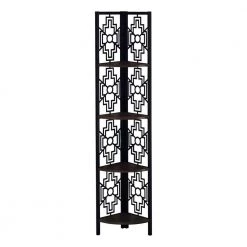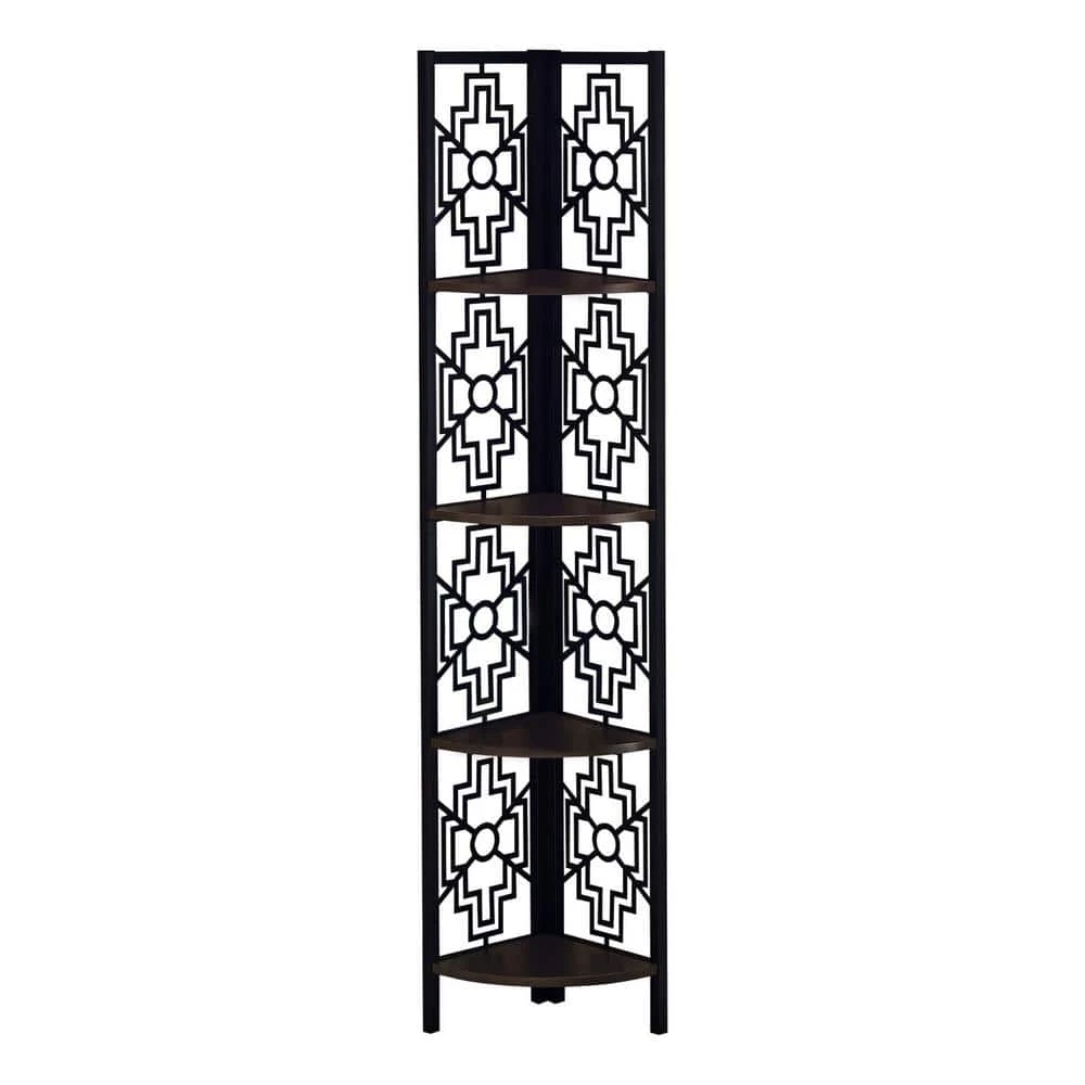 Let this stylish corner cabinet conquer the clutter in your small home, apartment or condo by providing 4 solid dark brown display shelves that are perfect for, photo frames, plants, other decorative items and even kitchen accessories. Perfect for, decluttering, this black metal corner cabinet features a transitional design that will elevate the look of your living room, bedroom. kitchen or office. This corner storage accent piece will add a touch of elegance to any room in your home.