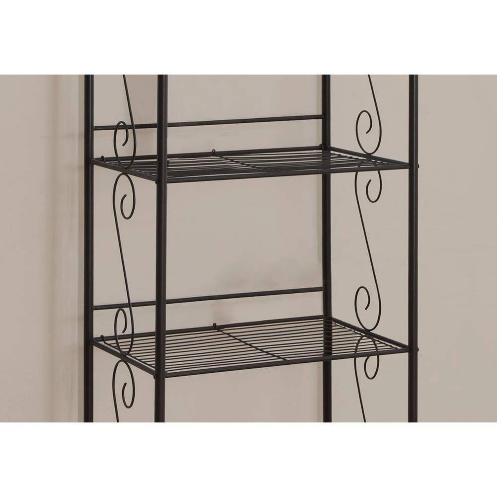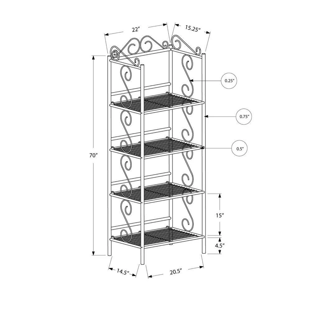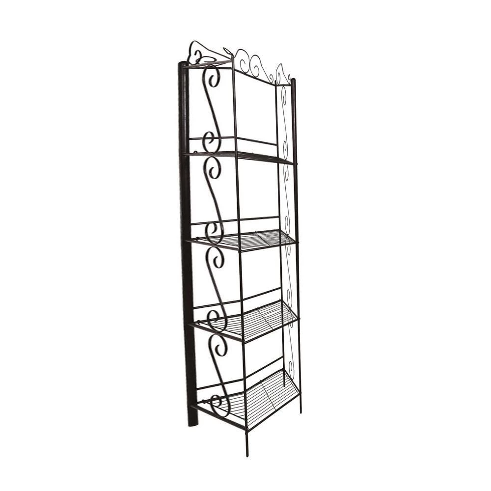 This elegant metal etagere/bookcase in a traditional style offers a distinctive storage solution that will blend in any room of your home. Featuring attractive scroll motifs on the side and along the top in copper metal, this etagere has four open shelves that offer an abundance of storage space for books, plants, pictures, candles and any other collectibles. Features a decorative, practical and durable bookshelf.