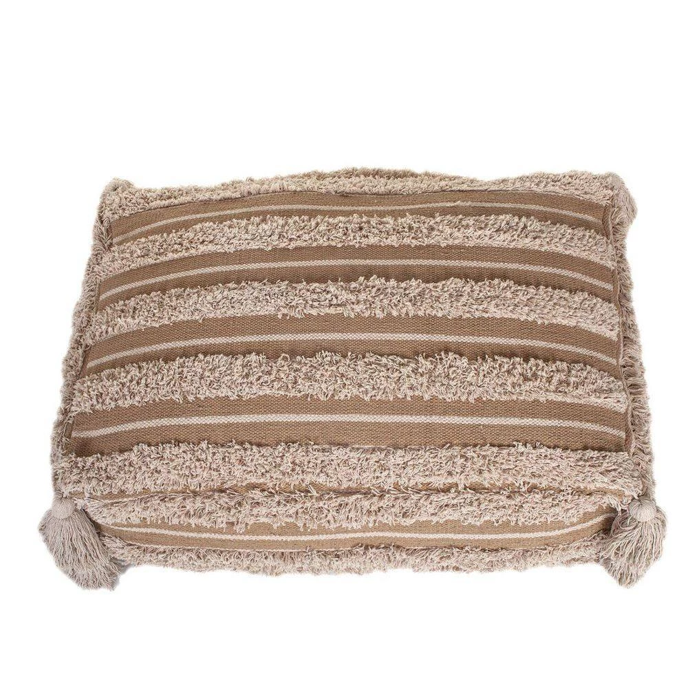 Who said poufs need to be simple and plain. Add something extra to your living room or bedroom with this Camel Fringe Stripe Pouf, complete with fringes everywhere and playful tassels on each corner. The camel color of the pillow looks fresh, updated, and stylish and the tassels and shag give it great texture and dimension. Use as a footrest, as a seat, or a table. 36 in. x 24 in. x 12 in.