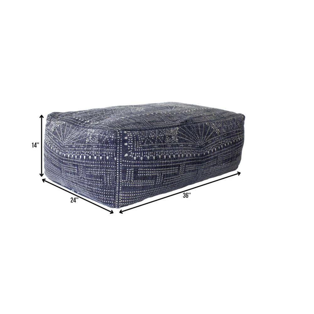 With this Navy Blue Patterned Rectangle Pouf you can add a touch of contemporary design with practical utility to your home. This poof has a rectangular shape and is covered by a soft rugged fabric. The fabric has a tribal inspired pattern on it in a navy blue and white colorway. The pattern gives this pouf a very unique look which will elevate any space in your home. The pouf has five separate pieces of patterned fabric that are stitched together at the edges seamlessly. Use this pouf anywhere in your home and it will look great owing to its minimal design and neutral colorway. Use it as a footrest or as an extra seating anywhere you want. 14 in. H x 36 in. W x 24 in. D.