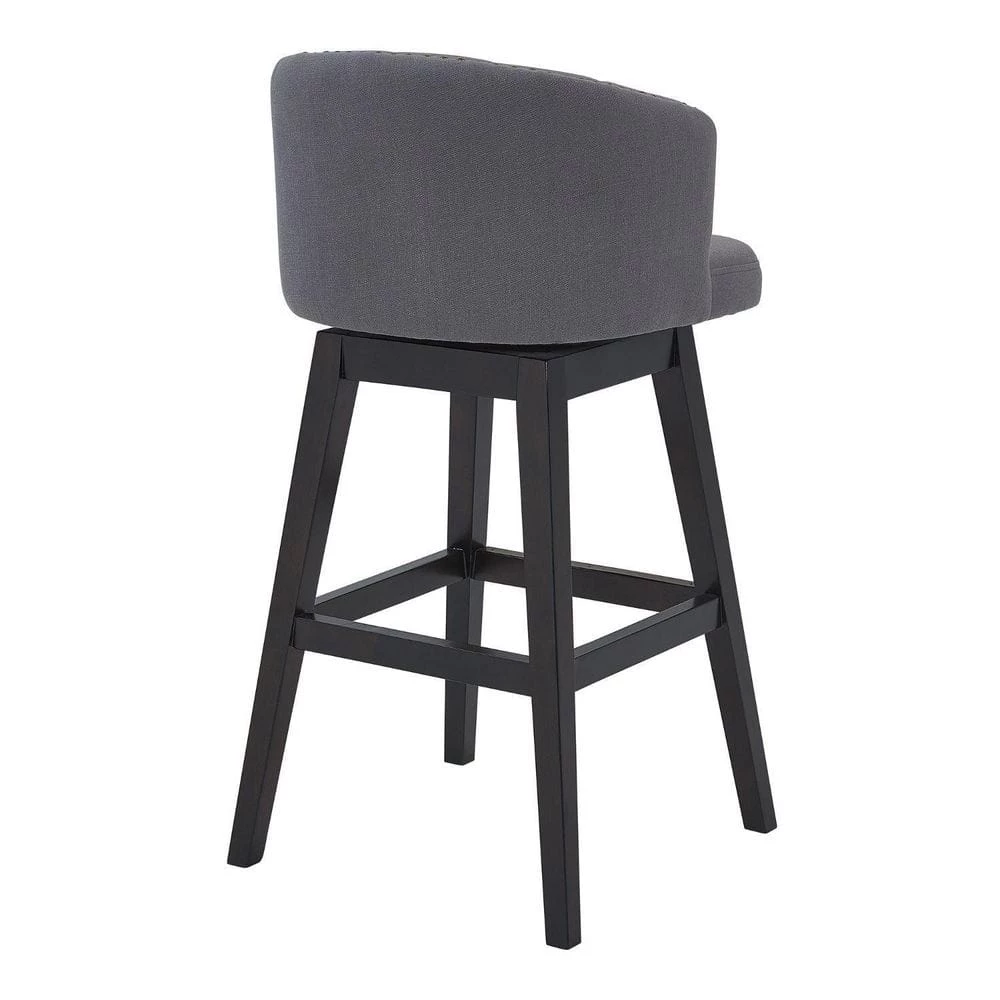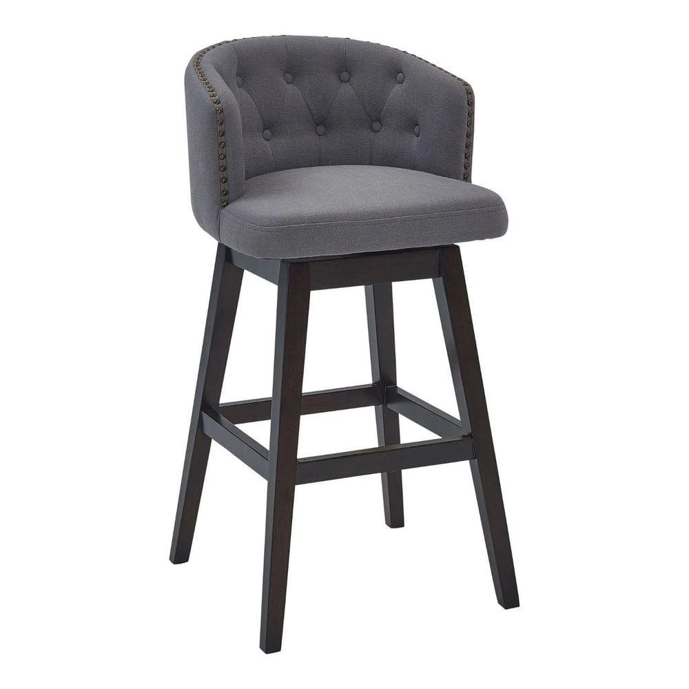 This 30″ Grey Tufted Fabric and Dark Espresso Wood Swivel Bar Stool is the perfect choice for anyone who wishes to enjoy comfort at its best. The stool is upholstered in grey fabric wrapped around plush cushioned seat with a rounded back and high-end tufted diamond stitching. This creates a special effect that makes the stool even more appealing to the eyes. It allows you to enjoy comfort and features beautiful nail head trim accents. You can be sure the bar stool won’t damage your floors, thanks to the floor protectors that are featured on the legs. The dark espresso wood finish marries perfectly with the slate gray of the fabric complemented by the elegant silhouette.39 x 21 x 21.5