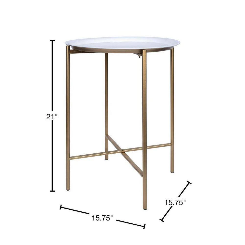 This Modern Metal Tray Top End Table is the perfect way to add a touch of contemporary elegance to your home. The table is made from solid metal and has a two tone finish. The tray table top has white finish on it and is in a round shallow tray shape. Underneath the table tray top there are four metal legs that have a shiny gold varnish on them set in an X-shaped base. You can use this table as an end table in your living room, as a side table for your bedroom, or just as a storage or display table anywhere in your home. This table will look great with any interior style or main theme that you have around your home due to its neutral colorway. 21″ H x 15.75″ W x 15.75″ D